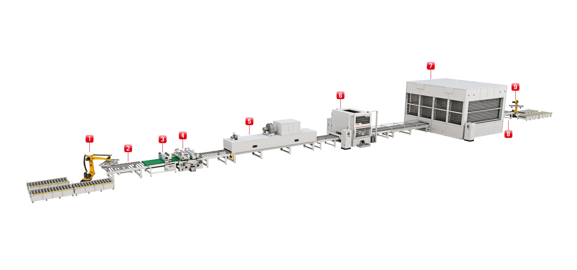 預輥實色乳膠中涂,再噴涂真石漆沙粒效果,避免了透底的現象。后段配平鋪式立體干燥房,避免了厚噴漆膜流掛的現象,同時實現油漆快速干燥,將能耗降至最優。