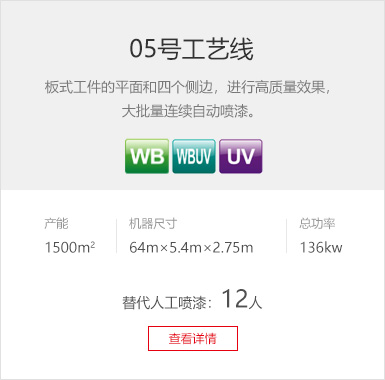 工藝要求 無(wú)溶劑uv底漆、水性面漆 產(chǎn)品種類 木門(mén)、門(mén)套、線條 產(chǎn)線數(shù)量 6條 設(shè)備特色 水性色漆的高質(zhì)量噴涂 生產(chǎn)產(chǎn)能 色漆噴涂線:400套門(mén)/8h (生產(chǎn)員3人/線)