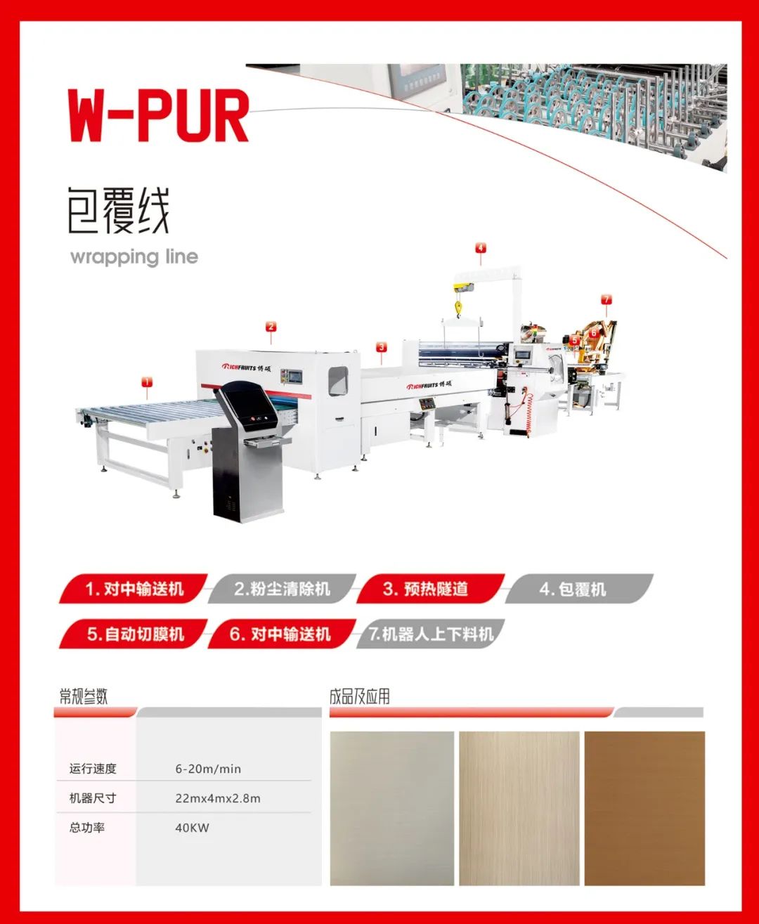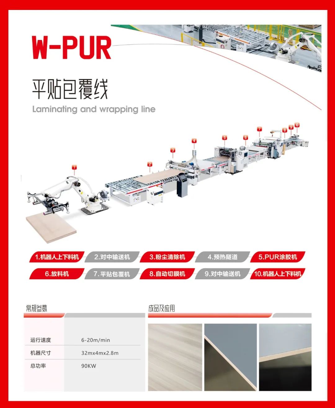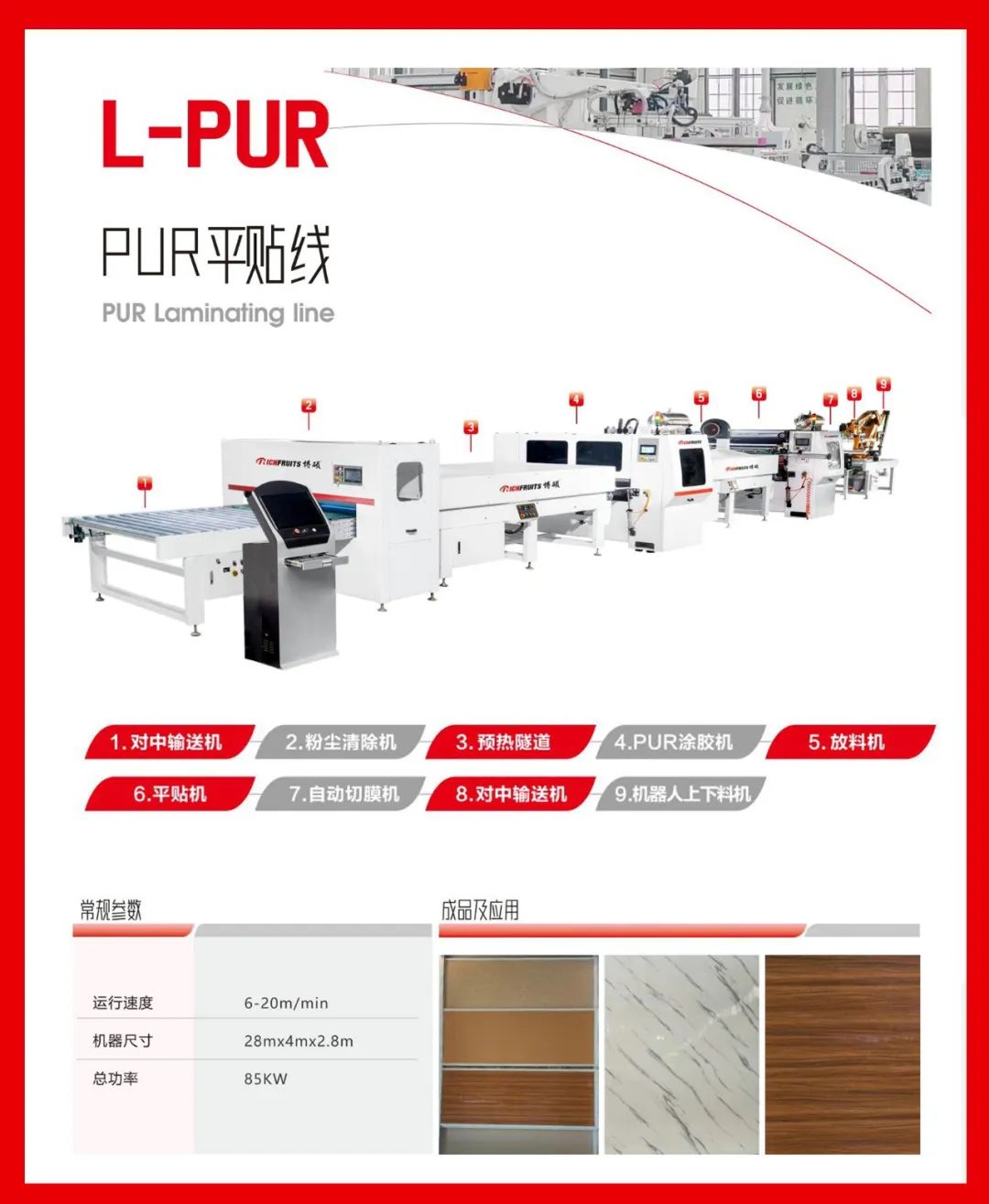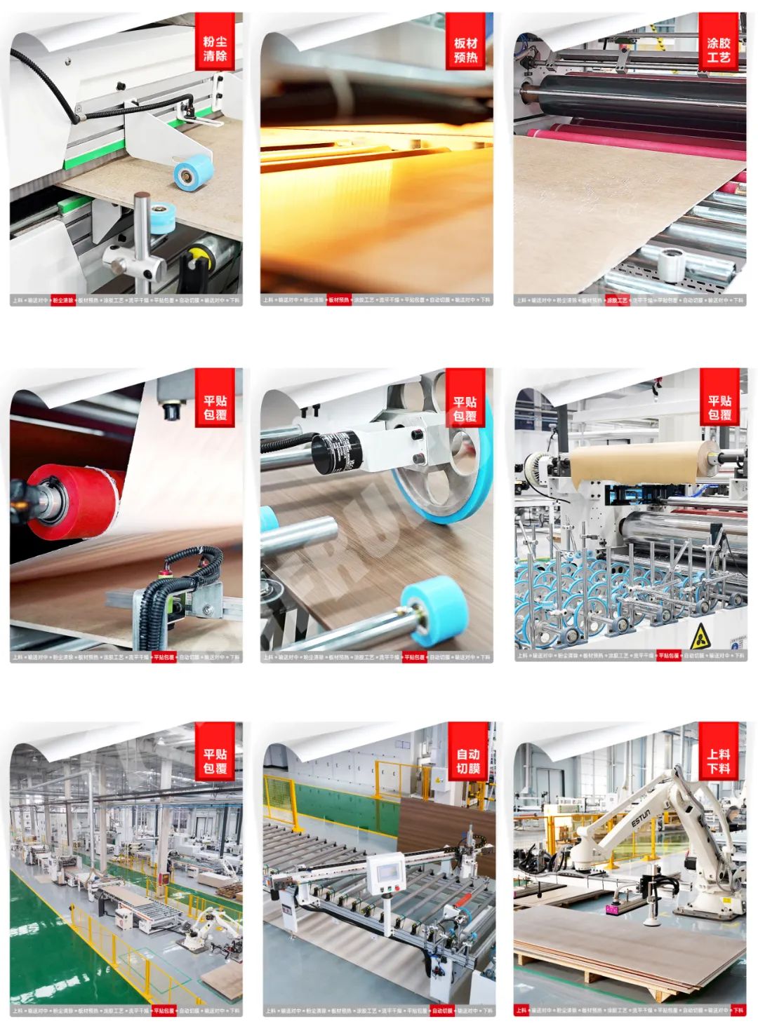 可片材、可卷材混合生產(chǎn)。通用PET、PETG、PP、PVC、CPL、防火板、亞克力、鋁箔、SPC等飾面材,利用PUR膠水均勻平貼或包覆到板材表面。 通用于包覆種類的產(chǎn)品,比如:硅酸板、水泥纖維板、門芯板多層墻板等材料進(jìn)行PUR膠水涂布后包覆各種柔性貼材。