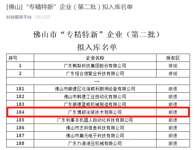 博碩根據《佛山市經濟和信息化局關于開展佛山市“專精特新”企業(第二批)入庫的通知》(佛經信函[2018]2143號)的要求,按照公開、公平、公正的原則,積極主動申報、服務機構審核推薦、專家組評審等環節有幸擬入庫佛山市“專精特新”企業(第二批)名單。