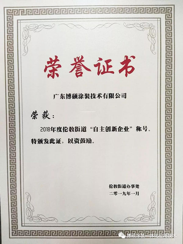 博碩榮獲“自主創新企業”稱號 會議期間,頒發了多個企業獎項! 本次獲獎的企業獎項:倫教交稅超億的6家,超3000萬的6家,超1000萬的21家,創新獎15家,廣東博碩涂裝技術有限公司,從倫教木工行業多家企業脫穎而出。 榮獲2018年度倫教街道“自主創新企業”稱號!