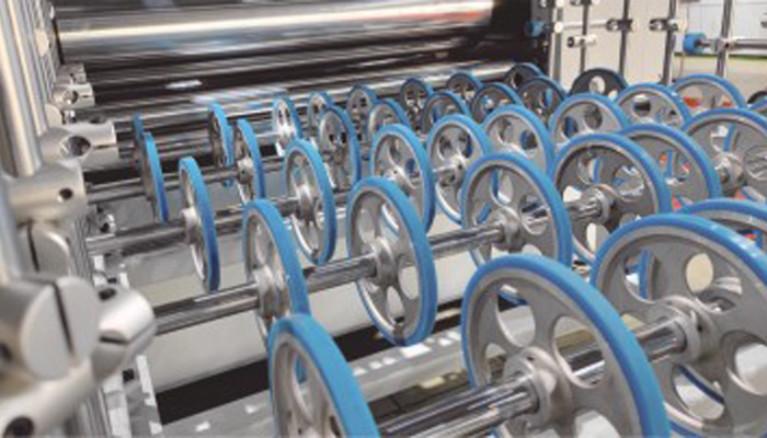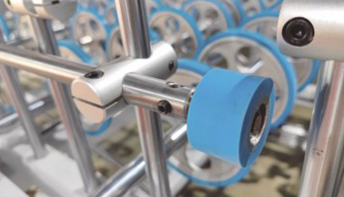 配置兩輥壓貼輥,一組膠輥和一組鋼輥;配膜張緊裝置;配電動吊葫蘆,實現(xiàn)膜吊裝上線;包覆輥可整體單邊調(diào)節(jié)移動,快速調(diào)整尺寸。