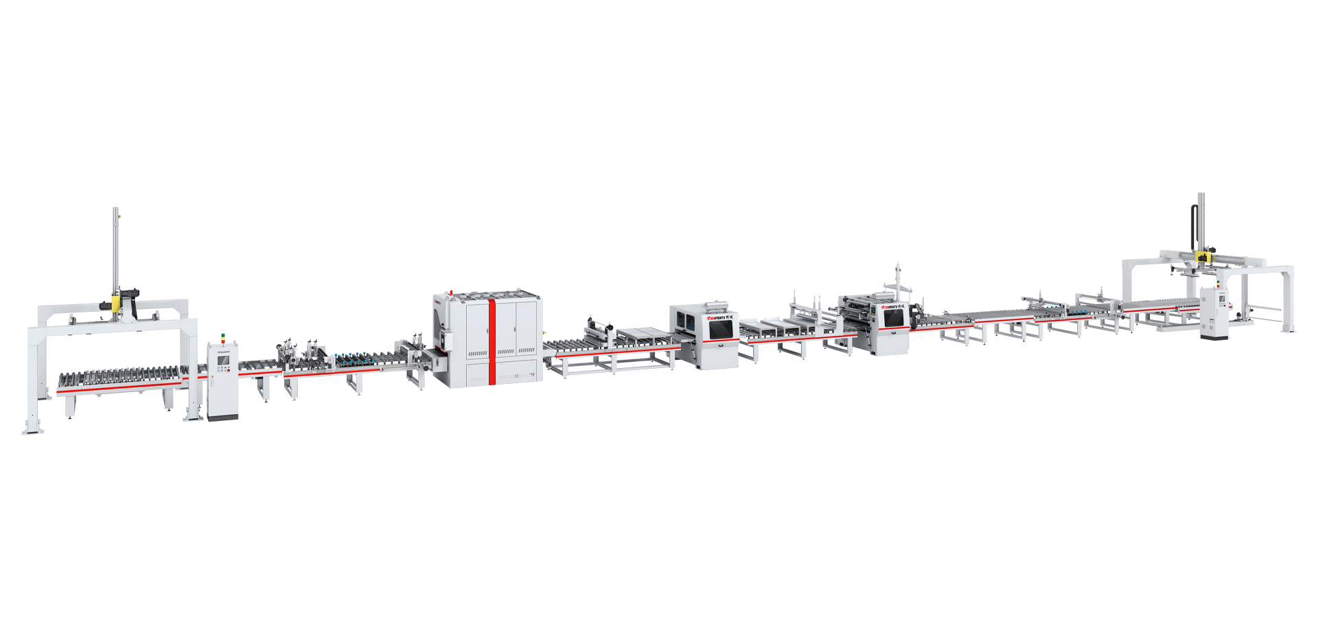 本生產線由:龍門上下料機 — 對中輸送機 — 輸送機 — 倒角機 — 砂光機 — 粉塵清除機 — PUR涂膠機(含溶膠系統) — 恒溫隧道 — 平貼機 — 斜切機 — 輸送機 — 精密修邊機 — 輸送機 — 對中輸送機 — 龍門上下料機 — 拉膜機等部分組成。