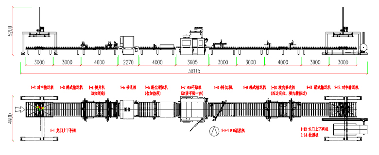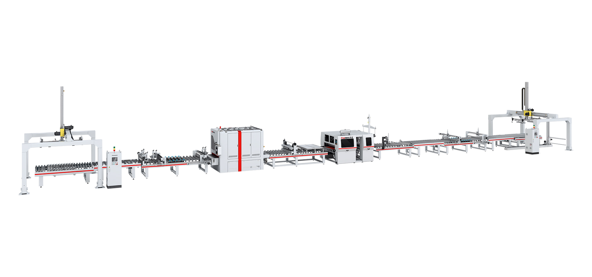 本生產線由:龍門上下料機 — 對中輸送機 — 輸送機 — 倒角機 — 砂光機 — 粉塵清除機 — PUR平貼機(含溶膠系統) — 斜切機 — 輸送機 — 精密修邊機 — 輸送機 — 對中輸送機 — 龍門上下料機 — 拉膜機等部分組成。