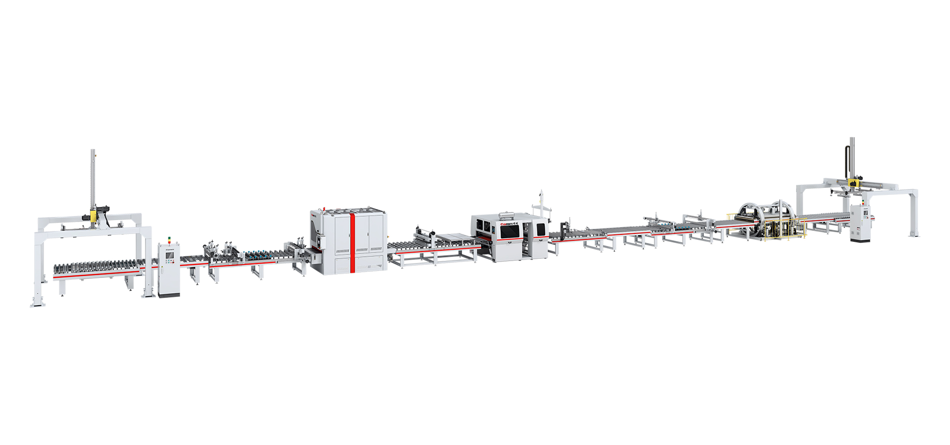 本生產線由:龍門上下料機 — 對中輸送機 — 輸送機 — 倒角機 — 砂光機 — 粉塵清除機 — PUR平貼機(含溶膠系統(tǒng)) — 斜切機 — 輸送機一精密修邊機 — 輸送機 — 圓筒式翻板機 — 對中輸送機 — 龍門上下料機等部分組成。