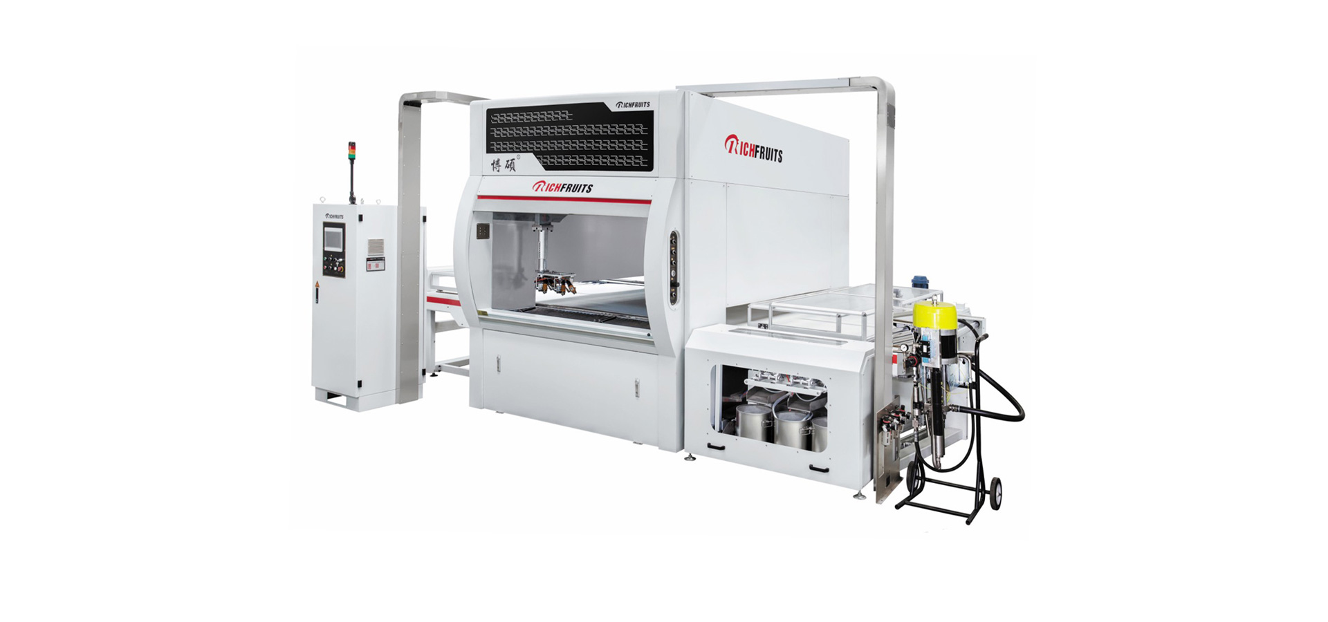 適用于實木家具、實木復合門、美式櫥柜、套房家具、衛浴柜、展示柜、工藝品等板式工件的平面和四個側邊,針對UV、PU、AC、NC和水性漆等,進行高質量效果連續自動噴漆,實現節能、環保和減少人工,提高產品質量和生產效率。