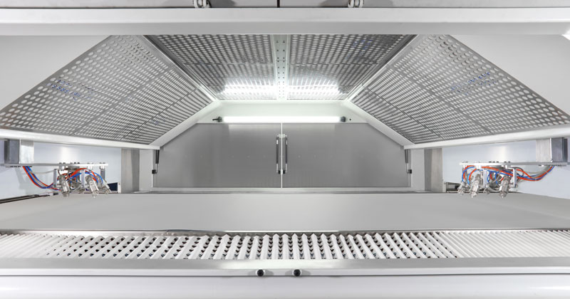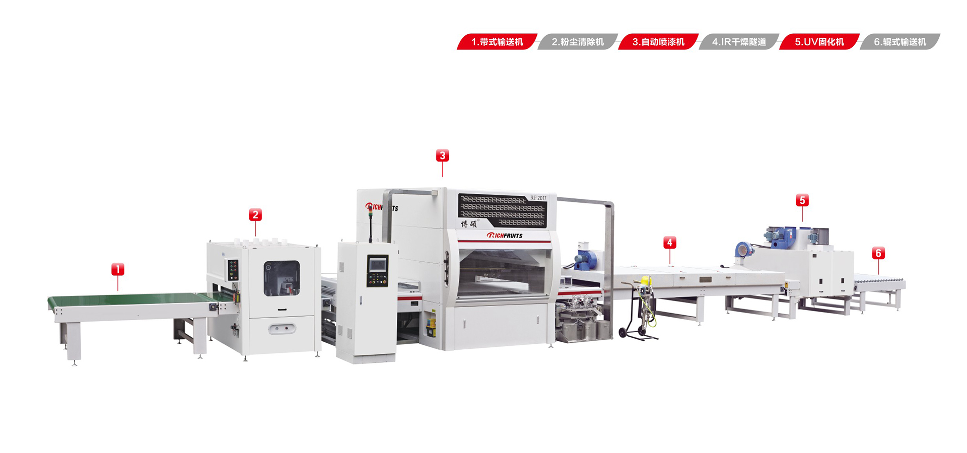 適用于板式家具、實木門、櫥柜門、工藝品、裝飾板、硅酸鈣板、玻鎂板、水泥纖維板的板式加工件的平面和四個側邊進行高質量、大批量連續噴漆。