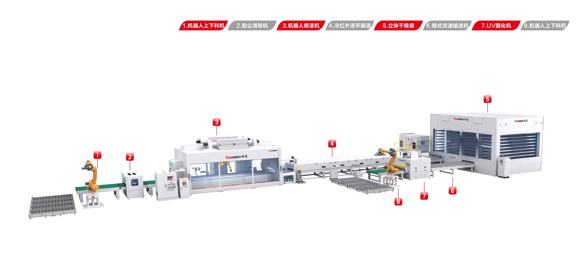 適用于板式家具、實木門、櫥柜門、工藝品、裝飾板、硅酸鈣板、玻鎂板、水泥纖維板的板式加工件的平面和四個側邊進行高質量、大批量連續噴漆。